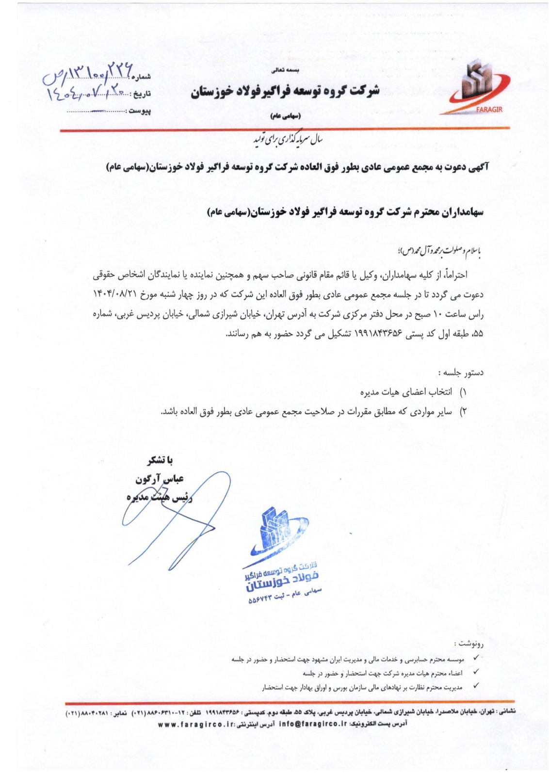 دستور جلسه: 1. انتخاب اعضای هیئتمدیره شرکت 2. سایر مواردی که مطابق مقررات در صلاحیت مجمع عمومی عادی بطور فوق العاده باشد.